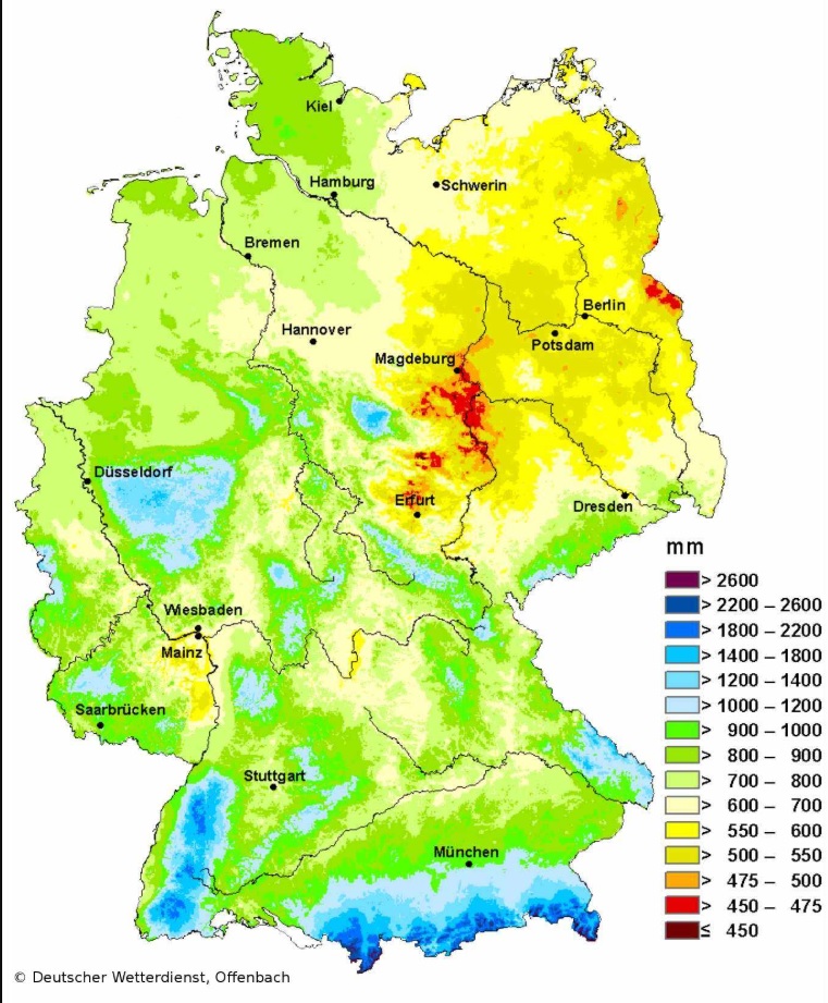 Der mögliche Regenwasserertrag errechnet sich aus dem mittleren Jahresniederschlag sowie aus Kennzahlen zum Dach. Sollten Sie den mittleren Jahresniederschlag vor Ort nicht wissen, können Sie ihn von dieser Karte ablesen. Weiter sollten Sie die projizierte Dachfläche in Erfahrung bringen. Diese ergibt sich aus der Grundfläche des Hauses plus den Dachüberständen.
